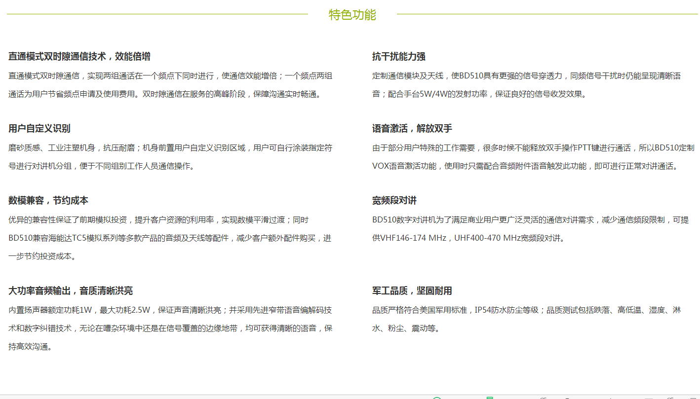 海能達BD510商業數字對講機採(cǎi)用2.5W高功能喇叭,並(bìng)結合數字降噪技術,即使身處嘈雜的環境仍能清晰的通話;支持雙時隙通信,節省頻率資料;數模兼容,提升客戶資源的利用率;軍工品質,滿足複雜通信環境需求。