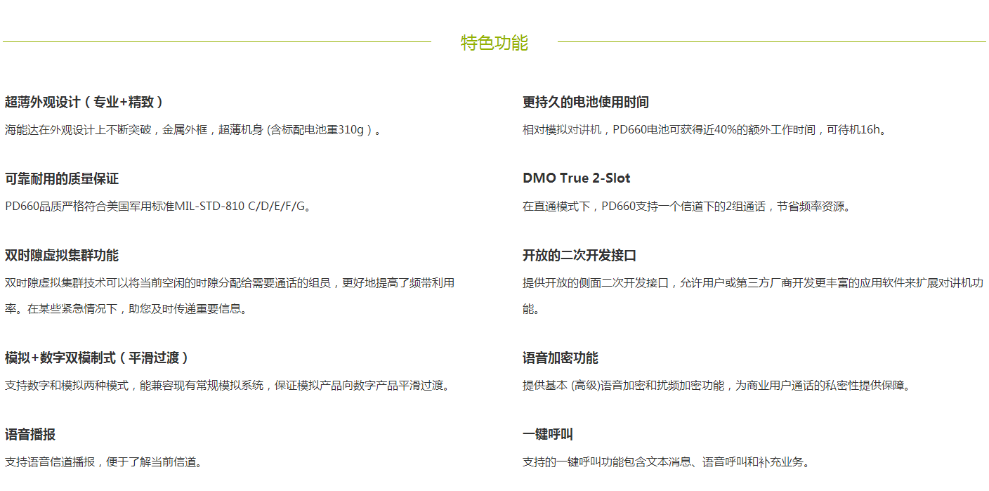 PD660按照PDT數字标準打造,創新金屬邊(biān)框外觀設計,質感和檔次彰顯無遺;IP67防塵防水等級,惡劣環境下使用仍能表現優異;先進的數字雙時隙技術,通話容量同比模拟增加一倍,成本大大降低;高級加密、遠程監聽等個性化管理手段以及豐富的二次開發等數據應用功能,讓通信具有瞭(le)無限可能。