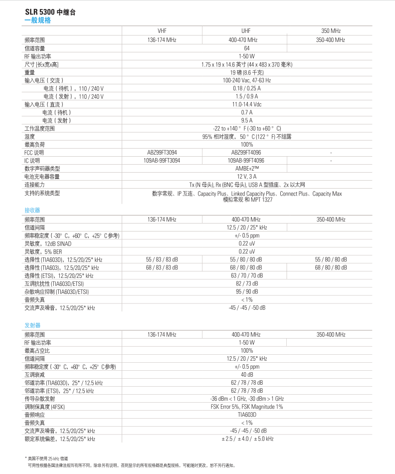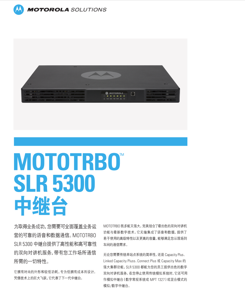SLR 5300中繼台在爲客戶提供全天候可靠運營,其高品質設計已通過摩托羅拉加速壽命測(cè)試 (ALT) 的驗證,並(bìng)符合嚴格的質量标準。爲在您的工作場所提供可靠的覆蓋,該産品還採(cǎi)用瞭(le)下一代接收器設計,具備較高靈敏度和噪聲抑制。即使在最嚴苛的條件下,它也能爲您提供清晰的語音質量。