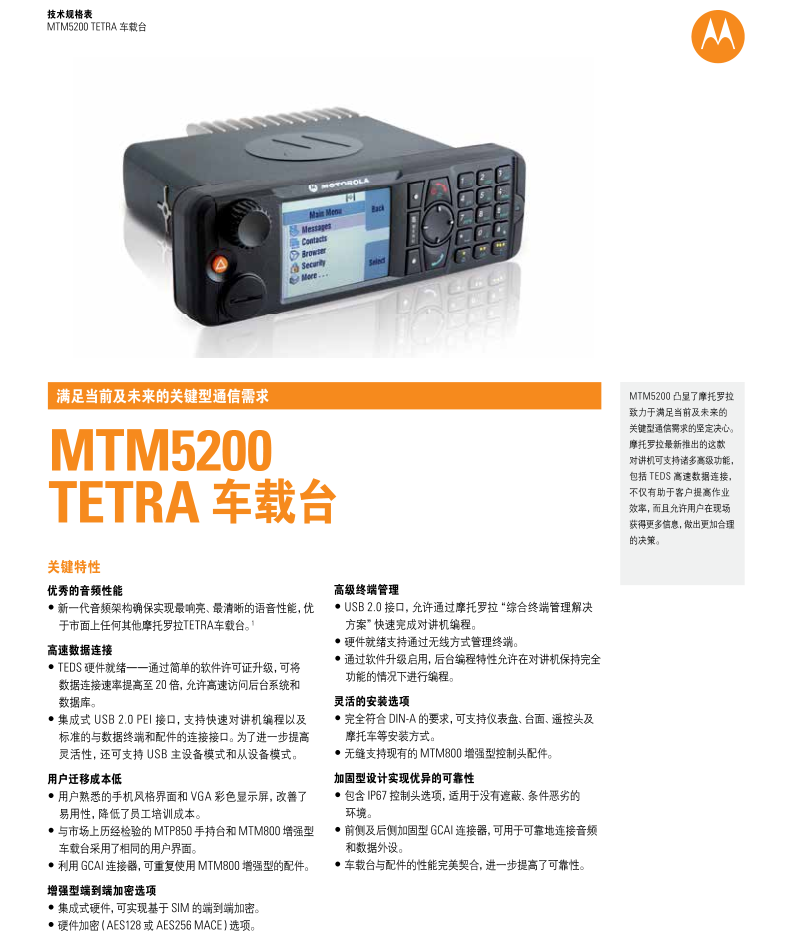 MTM5200 是全新 TETRA 對講機系列的基本型号。它具有當前 MTM5400 的強大音頻能力和接收機靈敏度,並(bìng)且可使用 TEDS 提供高速數據傳(chuán)輸服務,進而增強性能。