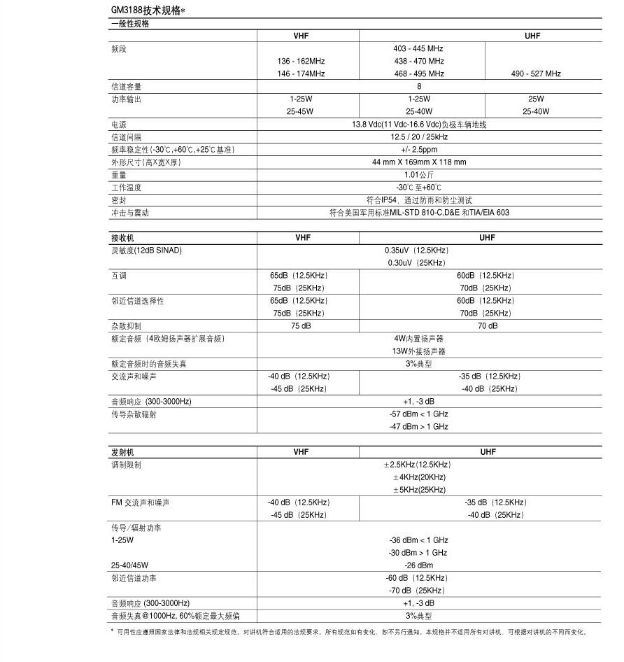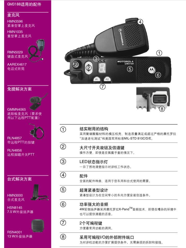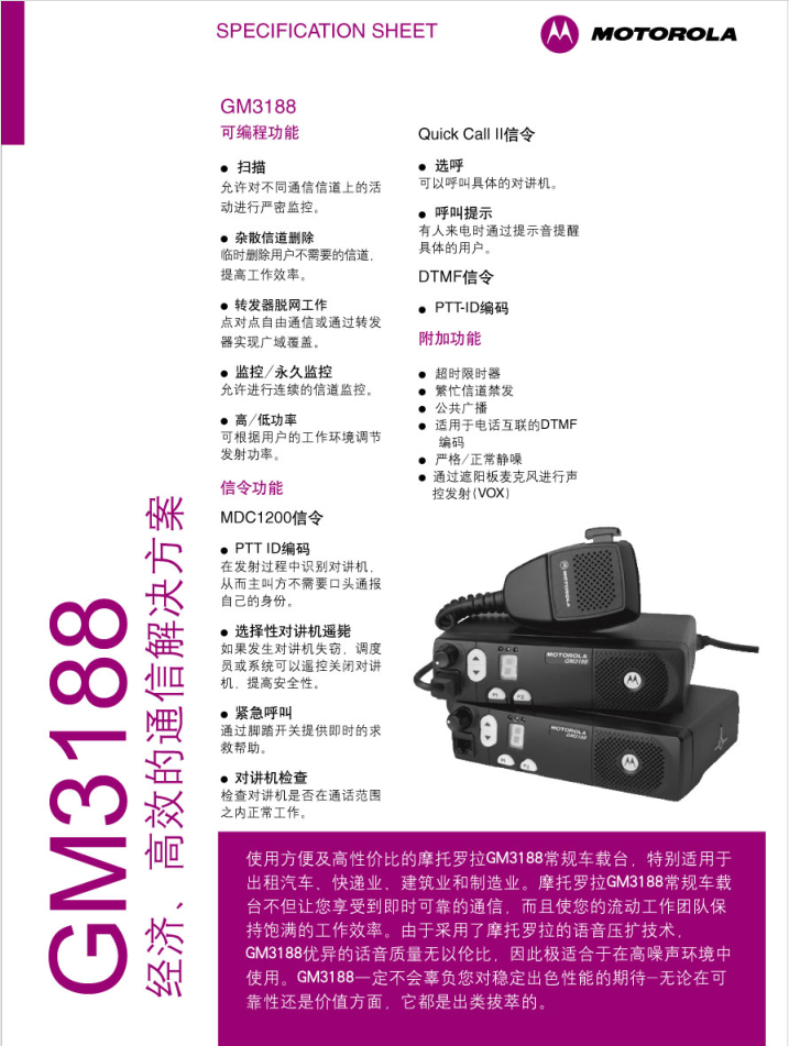 使用方便及高性價比的摩托羅拉GM3188常規車載台,特别适用於(yú)出租汽車、快遞業、建築業和制造業。摩托羅拉GM3188常規車載台不但讓您享受到即時可靠的通信,而且使您的流動工作團隊保持飽滿的工作效率。由於(yú)採用瞭(le)摩托羅拉的語音壓擴技術,摩托羅拉GM3188常規車載台優異的話音質量無以倫比,因此極适合於(yú)在高噪聲環境中使用。摩托羅拉GM3188常規車載台—定不會辜負您對穩定出色性能的期待-無論在可靠性還是價值方面它都是出類拔萃的。