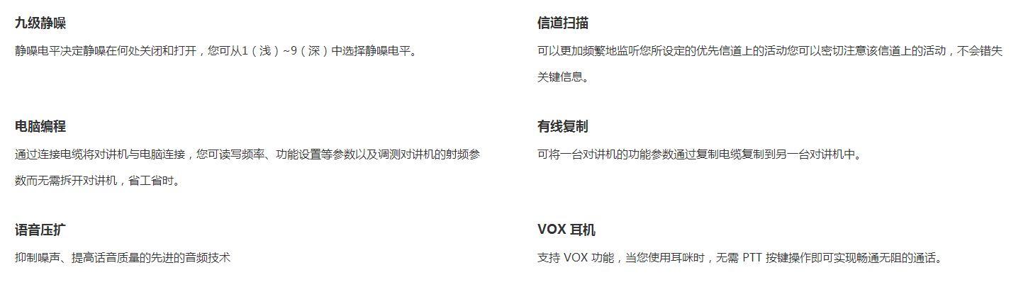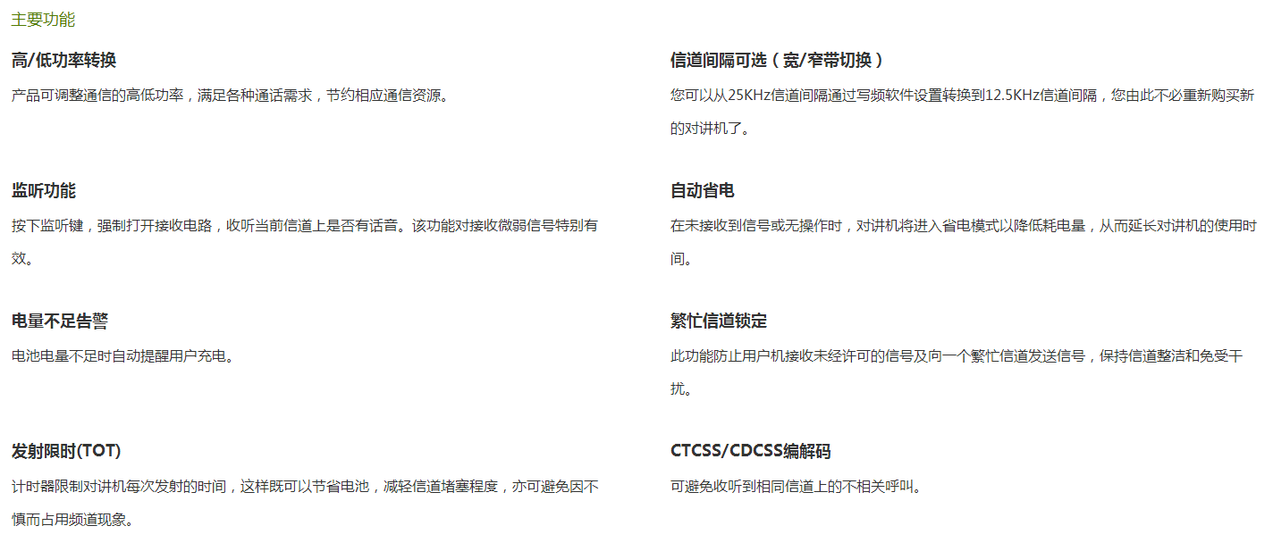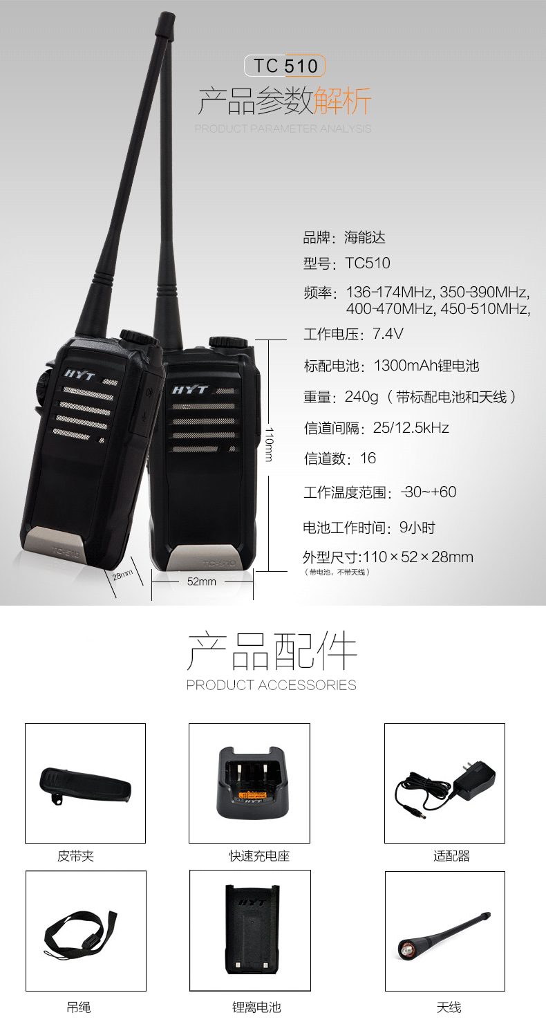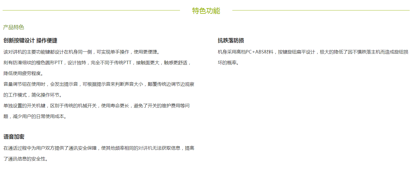 TC-510是一款堅固耐用、功能齊全的商業對講機。機身輕盈,攜帶方便,系在腰間也一樣輕松工作。 具有防滑細紋的橙色圓形PTT按鍵,符合人體工程學。左側(cè)的旋鈕集PTT、音量調節於(yú)一身,連同軟關機鍵,即刻實現單手操作通訊。 寬頻點覆蓋範圍,适合常規使用環境。防跌落損壞的設計結構、穩定可靠的電路、音量調節提示音及待機指示燈,都彰顯設計的人性化,爲您提供與衆不同的使用經驗。