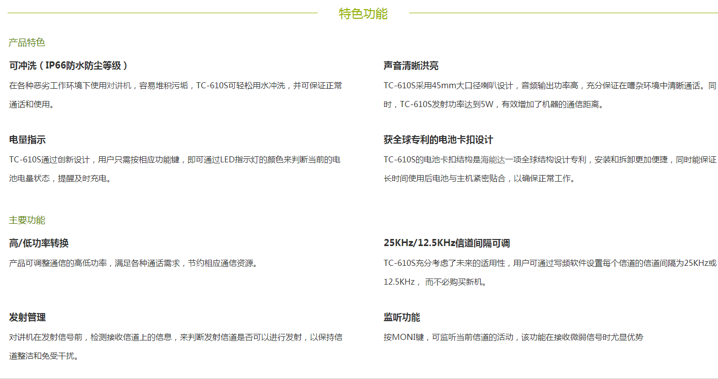 TC-610S是一款高品質防水專業對講機,IP66防水防塵等級,非常适用於(yú)戶外作業和經常涉水的工作者,粉塵污垢堆積後,可直接沖洗。高音頻功率和45mm大口徑喇叭設計,音質清晰洪亮,保證在嘈雜環境中仍能高品質通話。獲全球專利的電池卡扣技術,使用時間更長(zhǎng),操作更便捷。