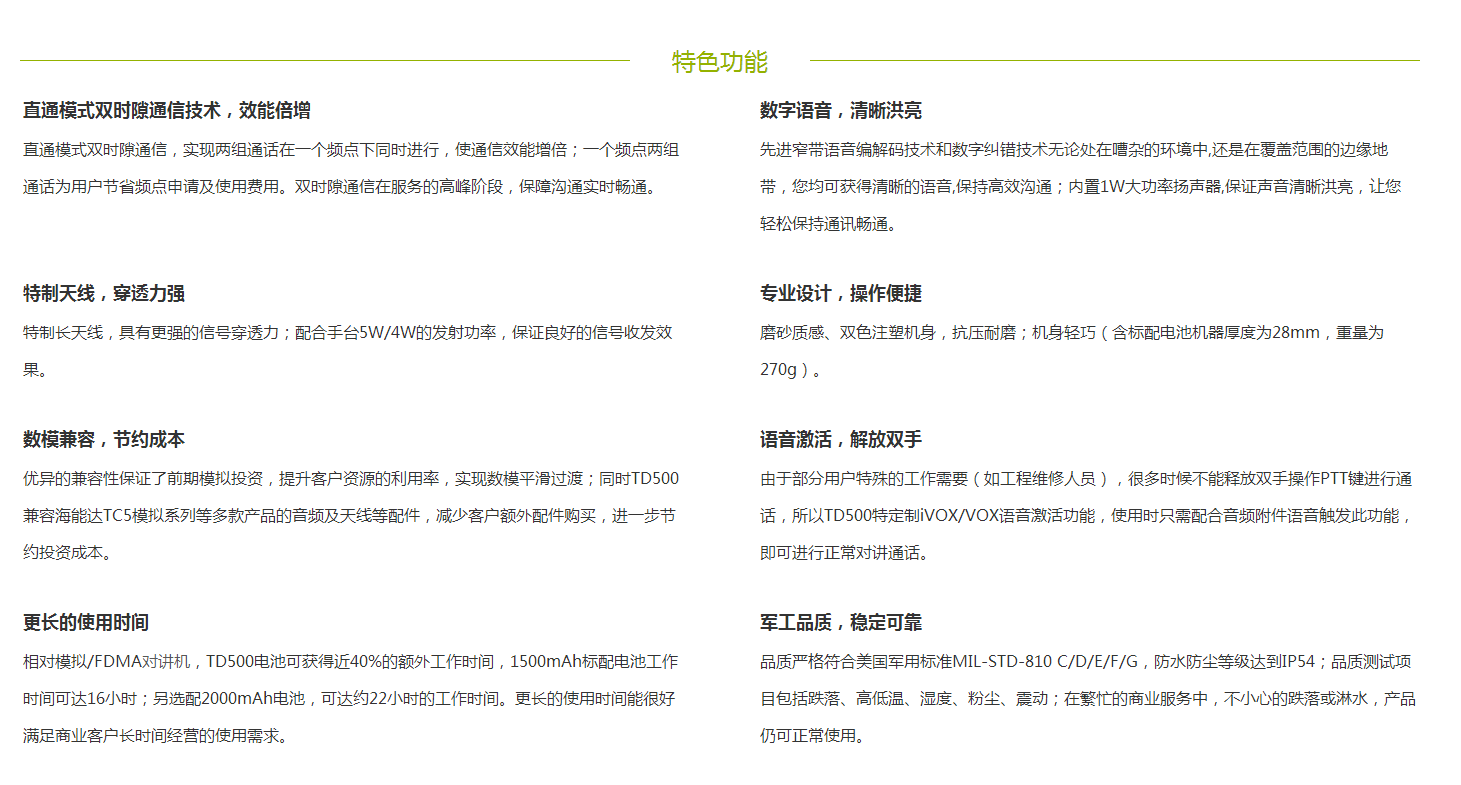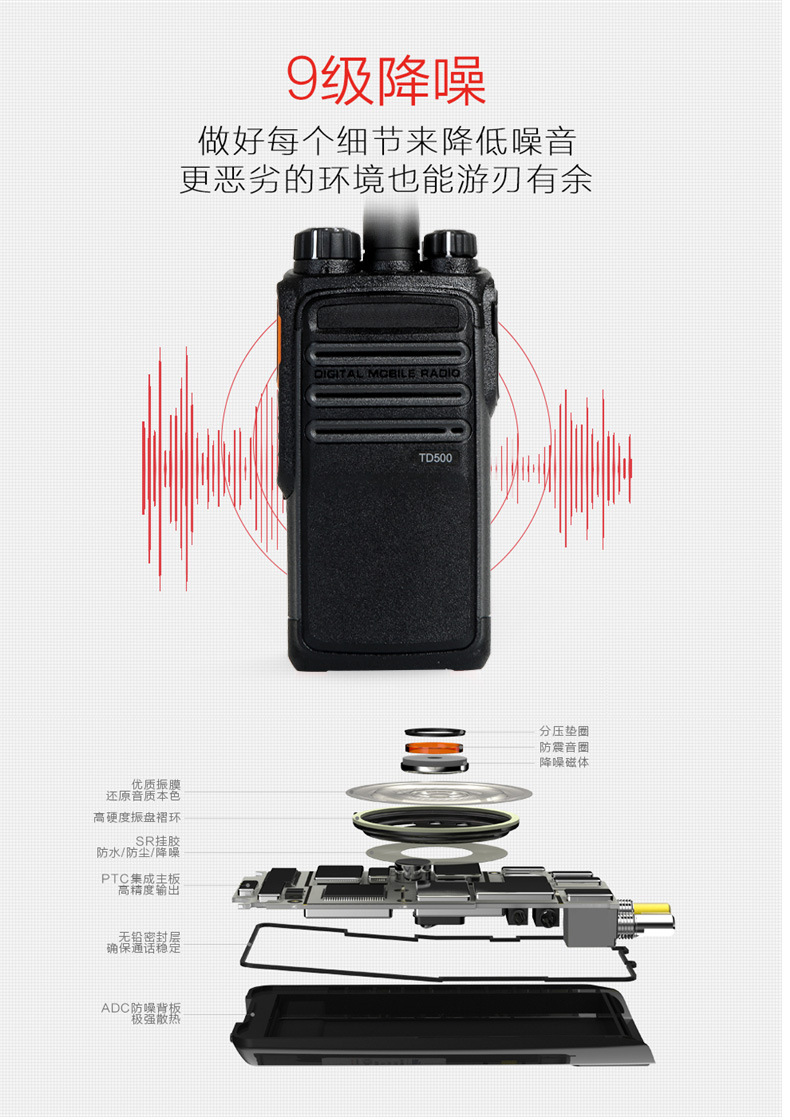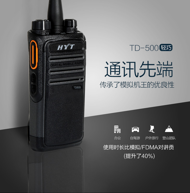 TD500傳承瞭(le)模拟機王的優良性,特有的數字悅音技術讓使用者身處嘈雜的環境中,仍能清晰的通話;雙時隙通信支持一個信道2組通話,節省頻率資源;TD500使用時長(zhǎng)比模拟/FDMA對講機提升瞭(le)40%。