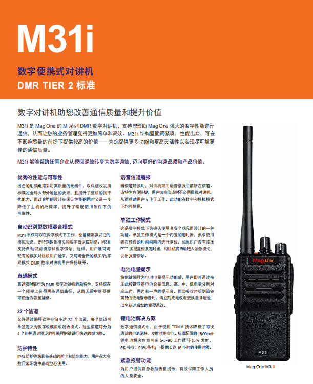 M31i 是 Mag One 的 M 系列 DMR 數字對(duì)講機(jī),支持您借助 Mag One 強大的數字性能進行