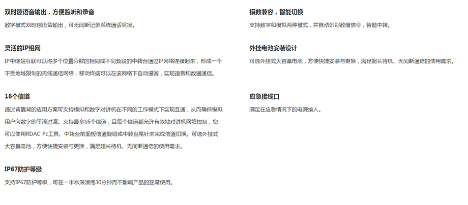 RD960是海能達按照PDT數字标準推出的首款數/模便攜式中轉台。採(cǎi)用内嵌式緊湊(còu)設計,内置mini型雙工器,整機小巧輕便。