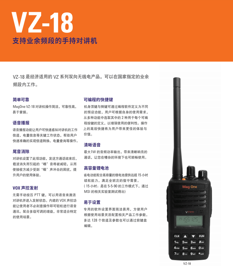 VZ-18 是經濟适用的 VZ系列雙向無線電産品,可以在國家指定的業餘頻段内工作。