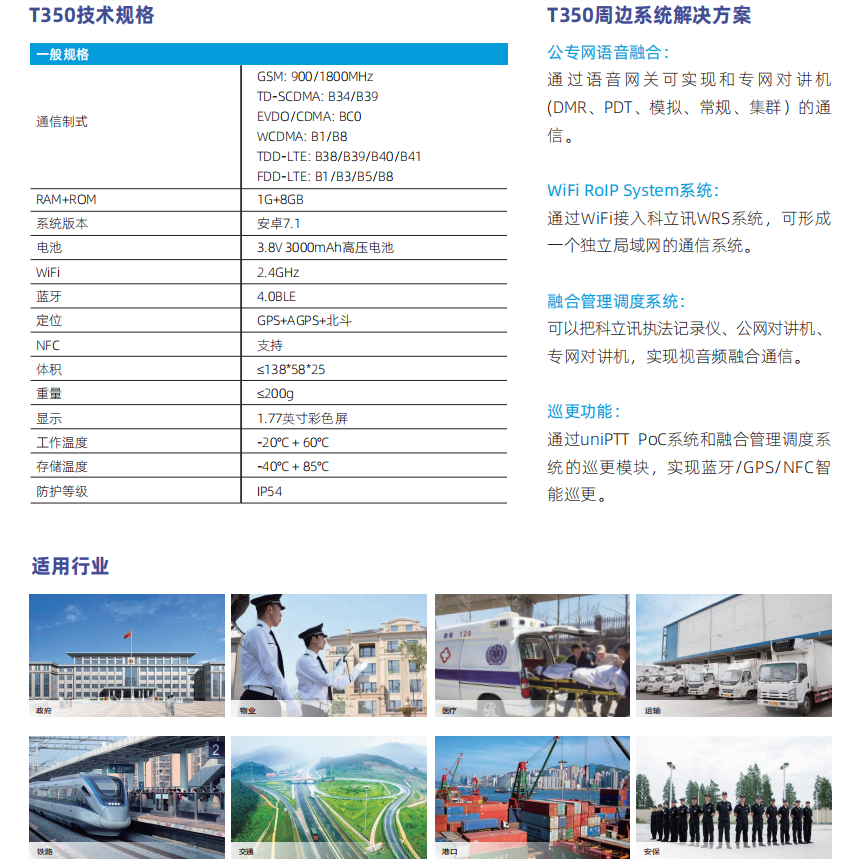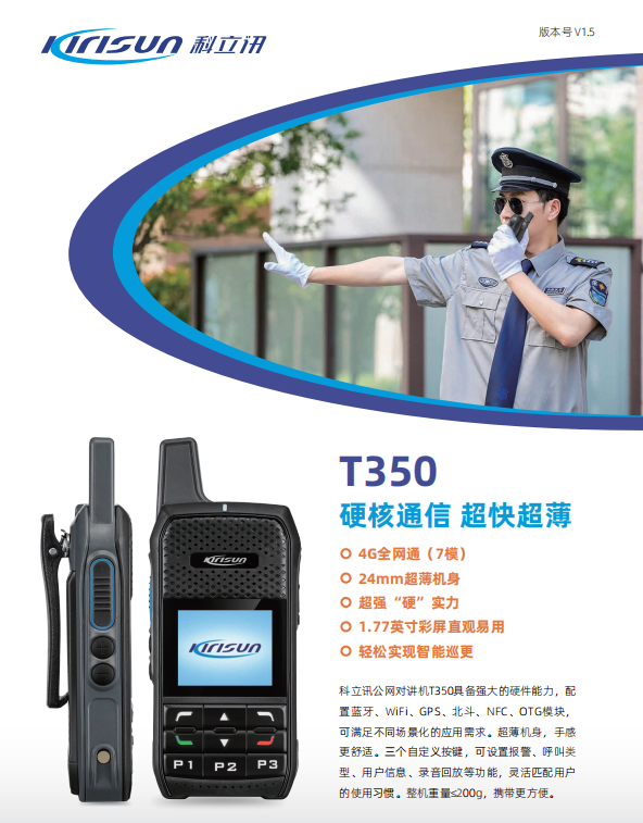 科立訊公網對(duì)講機T350具備(bèi)強大的硬件能力,配 置藍牙、WiFi、GPS、北鬥(dòu)、NFC、OTG模塊(kuài),