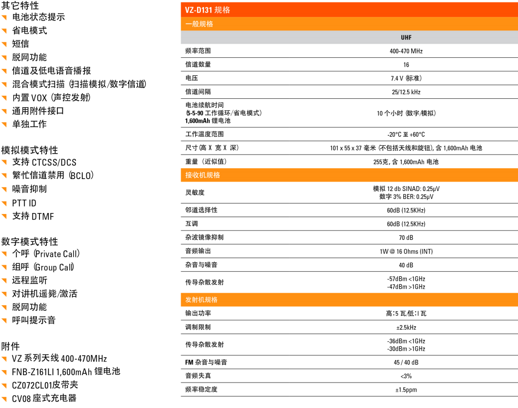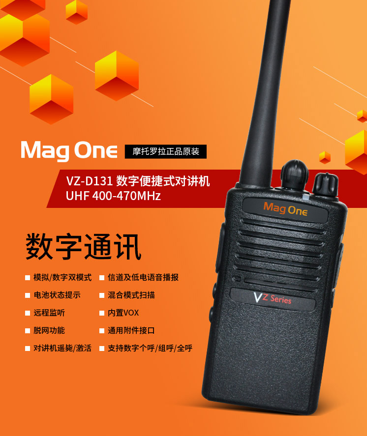 VZ-D131極具現代工業風格,簡約而不簡單,易用性突出。該便攜式對講機支持模拟和數字雙模式,便於(yú)用戶兼容目前使用的模拟對講機,並(bìng)可按照實際情況選擇轉換爲數字模式,盡享數字通信的優勢。