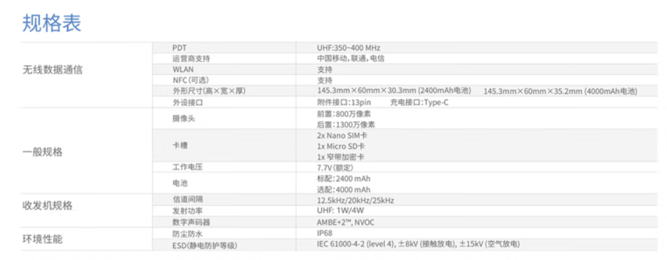 PDC690是一款融合PDT數字集群和LTE網絡,支持PDT集群業務、PDT語音室内通信、單北鬥定位、視頻採(cǎi)集調度等多種業務,滿足應急用戶實戰使用的多模智能終端。以關鍵任務爲中心,外型設計上具備(bèi)多功能旋鈕、可編程實體按鍵以及模塊化的屏幕顯示;新增Type-C通用接口讓用戶在執行任務時能便捷充電;更具有堅固耐用、防塵防水、阻燃外殼等特性,适合各種複雜多樣的戶外搶險救援場景。