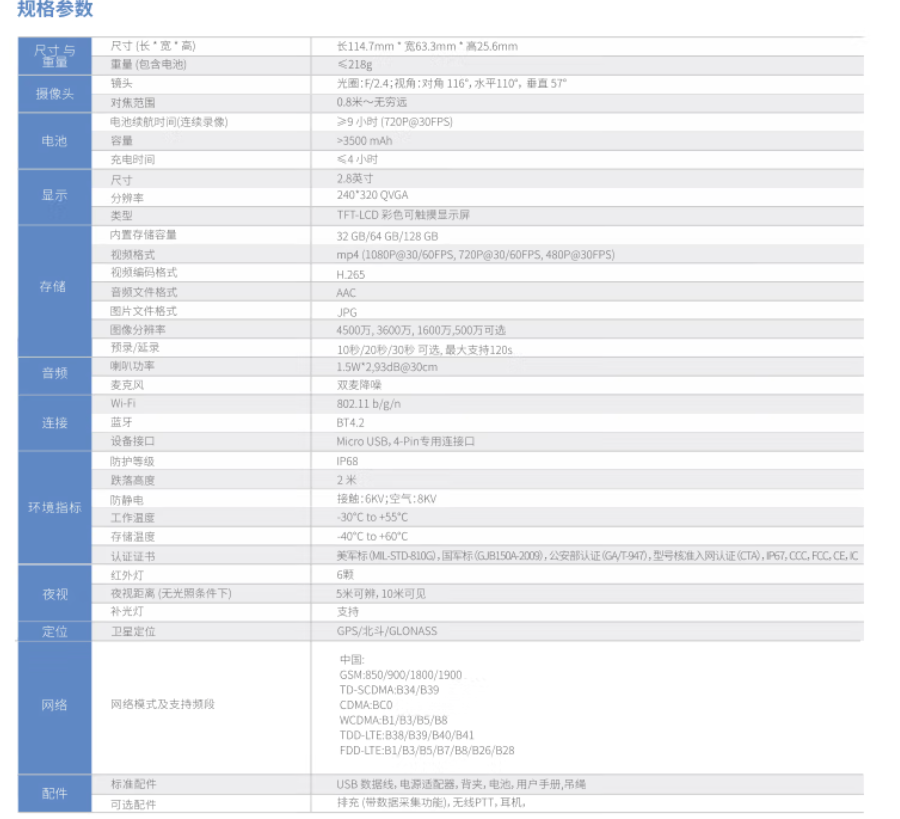 公司首款4G執法記錄儀,採(cǎi)用最新高效視頻編碼及雙碼流技術,低帶寬,高壓縮,實現快速高清視頻回傳同時集公網對講於(yú)一身,其開放性平台,可與多個第三方後台适配兼容使用。