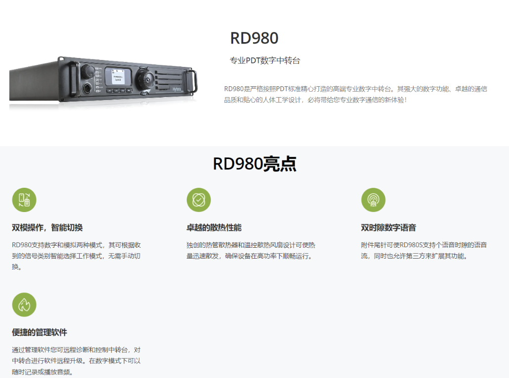 RD980是嚴格按照PDT标準精心打造的高端專業數字中轉台。其強大的數字功能、卓越的通信品質和貼心的人體工學設計,必将帶(dài)給(gěi)您專業數字通信的新體驗