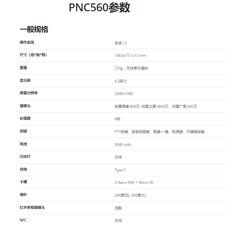 海能達PNC560是一款集專業PTT、專業戶外大屏、掃碼頭 、堅固機身等於(yú)一體的5G專業安全終端。滿足行業用戶關鍵語音、實時視頻 、掃碼應用、行業APP等多場景業務需求,助力用戶提高溝通效率、提升業務效能。作爲一款安全終端,PNC560具備(bèi)硬件、操作系統、應用軟件及業務數據的多重安全保障,全方位保護設備(bèi)和用戶數據的安全性。