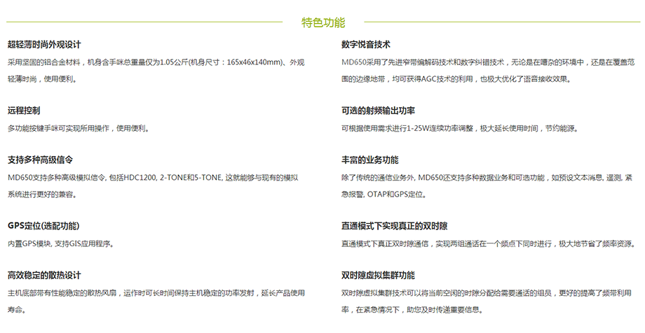 MD650數字車載台,擁有超輕薄時尚外觀設計,採(cǎi)用堅固的鋁合金材料,機身含手咪總重量僅爲1.05公斤(機身尺寸:165x46x140mm)、外觀輕薄時尚,同時配備多功能帶屏按鍵手咪,操作簡單便捷。可根據使用需求進行1-25W連續功率調整,極大延長使用時間,節約能源。同時直通模式下真正雙時隙通信,實現兩組通話在一個頻點下同時進行,極大地節省瞭(le)頻率資源;主機底部帶有性能穩定的散熱風扇,運作時可長時間保持主機穩定的功率發射,延長産品壽命。