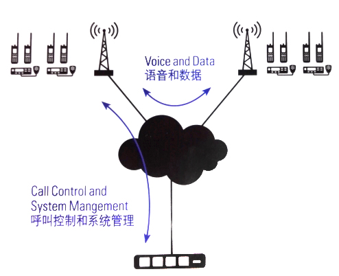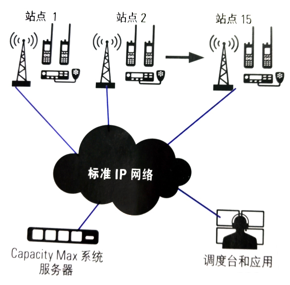 CapacityMax集群系統結構簡單,每個站點具有獨立的控制信道。它由中心系統服務器通過IP網絡與各站點相連。系統可以有1-15個站點,每個站點可配置15個語音信道機和6個數據信道機,使得每個站點的信道數可以達到1個控制信道,29個語音信道和12個數據信道,支持3000個用戶。而6個數據信道機可支持短信,GPS等數據業務。這種将語音和數據分開傳輸的做法,極大地提升瞭(le)數據的傳輸效率,避免瞭(le)語音和數據的沖(chōng)突。
