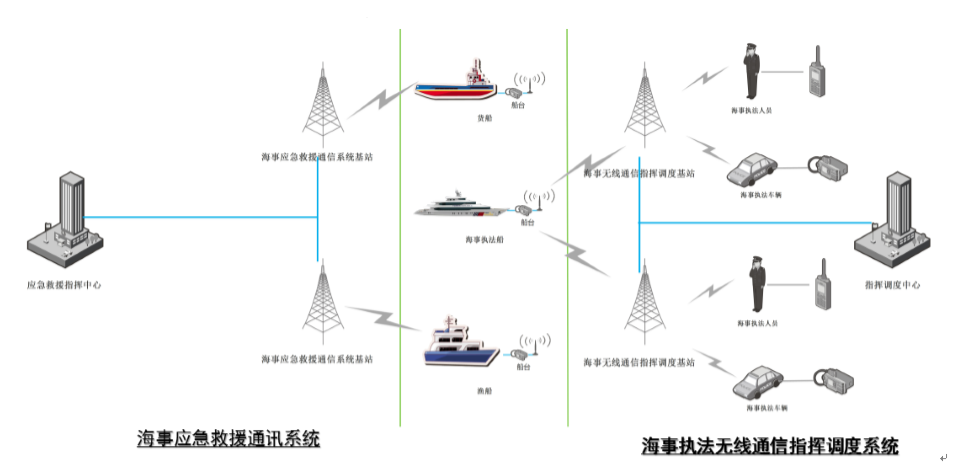 目前XX省水域内船舶採(cǎi)用VHF海事頻率進行通信,爲保證系統的兼容性,所以採(cǎi)用模拟基地台對(duì)航段水域進行覆蓋,實現船台與海事部門的呼叫連通,設計架構如圖4所示: