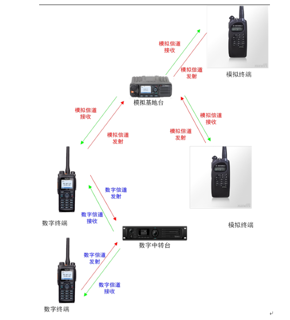 數字執法終端平時工作在數字信道,開啓自動掃描的功能,當有模拟呼入時,可以及時跳轉信道;當數字執法終端想主動呼叫模拟終端時,可以通過旋轉信道,實現對模拟對講機的呼叫。