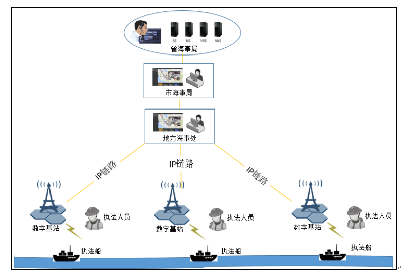水域沿線數字基站通過頻點(diǎn)規劃,採(cǎi)用甚高頻VHF數字信号覆蓋所在水域,水域内執法船舶、陸地執法人員可通過對應數字頻道接入該區域的對應基站進行語音呼叫。