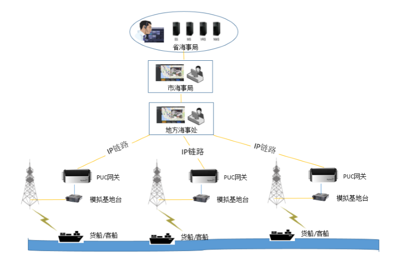在模拟基地台接入PUC網關,通過IP有線鏈路連至海事内部通信網絡,将該中轉台下的語音呼叫傳(chuán)輸至地方海事處(chù)-市海事局-省海事局,将省内所有模拟基站進行語音彙聚。