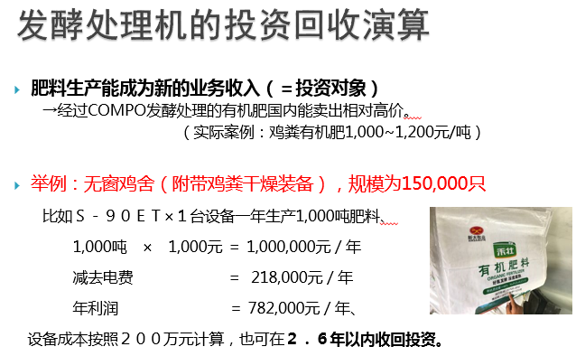【概要描述】畜禽養殖行業糞污治理及資源化(三位一體)整縣推進模式 1、分散式小型養殖企業: 優點:投加BECS撒布菌,解決發酵床異味及防止氮元素流失,提高有機肥品質。 異位發酵床 2、大中型養殖企業糞污生産有機肥 有機肥生産車間 3、COMPO立式除臭封閉發酵機 處理能力:10t/h 發酵方式:連續發酵 設備特點: (1)利用發酵熱量:使用保溫材料,有效利用發酵熱,使得即使在北方冬季也穩定發酵。 (2)確保通氣性:因爲用罐内的種肥進行調整水分,所以不用輔料,用攪拌裝置確保發酵槽内的通氣性。 (3)供給氧氣(空氣):用送風機提供發酵罐罐内氧氣。 (4)遠程操作界面,不需人員長期旁站。 養豬場糞渣制有機肥蛋雞場雞糞制有機肥食品垃圾制有機肥屠宰場制有機肥 4、三位一體模式 生物質制炭技術、炭基生物有機肥、畜禽糞便污水處理綜合利用(簡稱三位一體處理) 三位一體模式主要用於美麗鄉村建設、農牧結合、有機循環農業經濟及農業農村觀光旅遊業。
