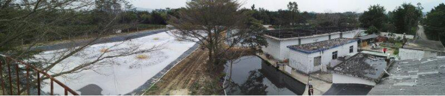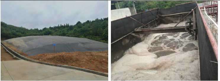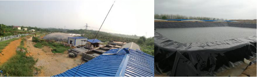 湖南某豬場(chǎng)污水處(chù)理站遠眺 湖北浠水某 30000m3 黑膜沼氣池(已鋪防滲底膜)